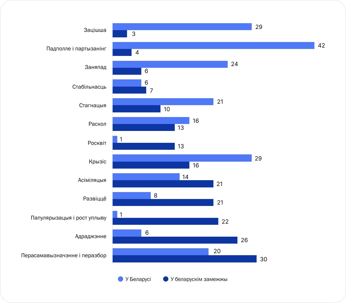 Актуальны аналіз паказвае адыход ад мадэлі развіцця, пабудаванай на салідарнасці міжнароднай супольнасці і пратэсных беларусаў. Пошук новых пунктаў апоры як у фінансах, так і ў тэме творчасці бачым па ўсёй плошчы эмігранцкага культурнага поля. Але вынік і паспяховасць гэтага працэсу вельмі неаднародныя. Ёсць культурныя кірункі і актары, што іх рэпрэзентуюць, якія за 5 гадоў значна паглыбіліся ў замежны культурны ландшафт і даволі камфортна ўжо сябе ў ім адчуваюць, а ёсць і тыя, хто толькі пачынае гэты шлях.